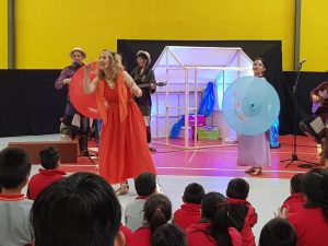 Una hermosa presentación realizó hoy la compañía «Comediantes de la Cacharra Verde» de España, con su obra «La casita de los cuentos» en el gimnasio de nuestra escuela. Con una maravillosa puesta en escena, los niños disfrutaron de una obra interactiva en la que pudieron jugar, cantar y bailar, junto a los artistas. Esta pieza teatral se presentó en el marco del Festival Internacional de Teatro Itinerante por Chiloé Profundo, Fitich.