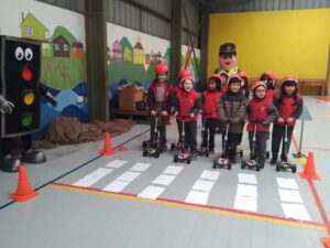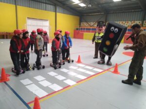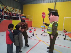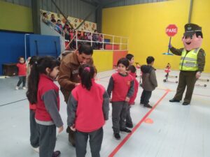 Agradecemos la visita del Suboficial Mayor Daniel Ampuero; Suboficial Claudio Barría; Cabo Primero Norberto Tobar, y el Suboficial Héctor Alarcón, quienes de manera entretenida y lúdica, junto a los amigos «Cabezas» y «Semaforin», enseñaron a todo el primer ciclo las reglas del tránsito, para desenvolverse con seguridad como peatones, y el día de mañana, como conductores.