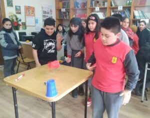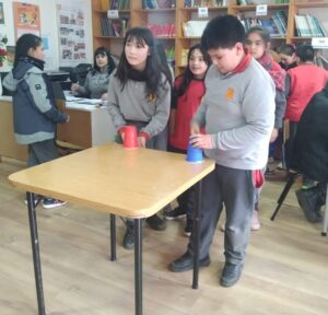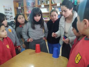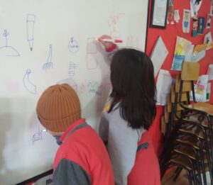 En el Taller de Arte Terapia, nuestros niños de tercero y cuarto básico, junto a la monitora Jocelyn Pino, realizaron una entretenida gincana en vísperas de Fiestas Patrias. Cada equipo debía dar vuelta un vaso plástico, correr a la pizarra y dibujar algo que comience on la letra de su nombre.